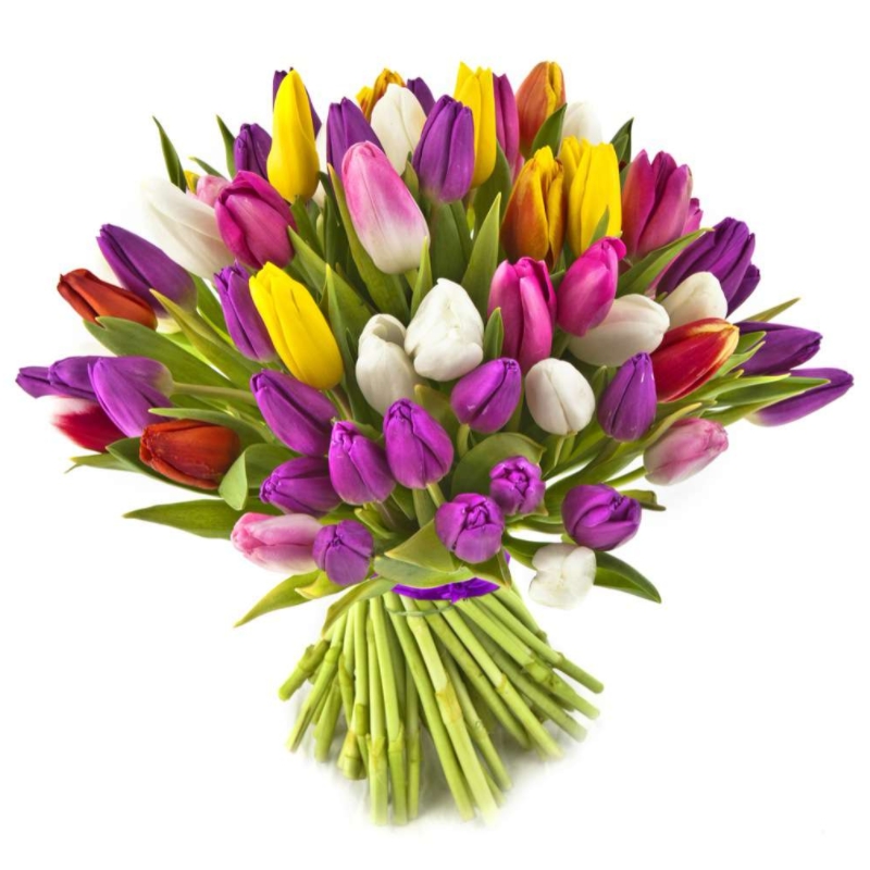 Букет состоит из MIX из 45 тюльпанов, прозрачная упаковка, атласная лента.