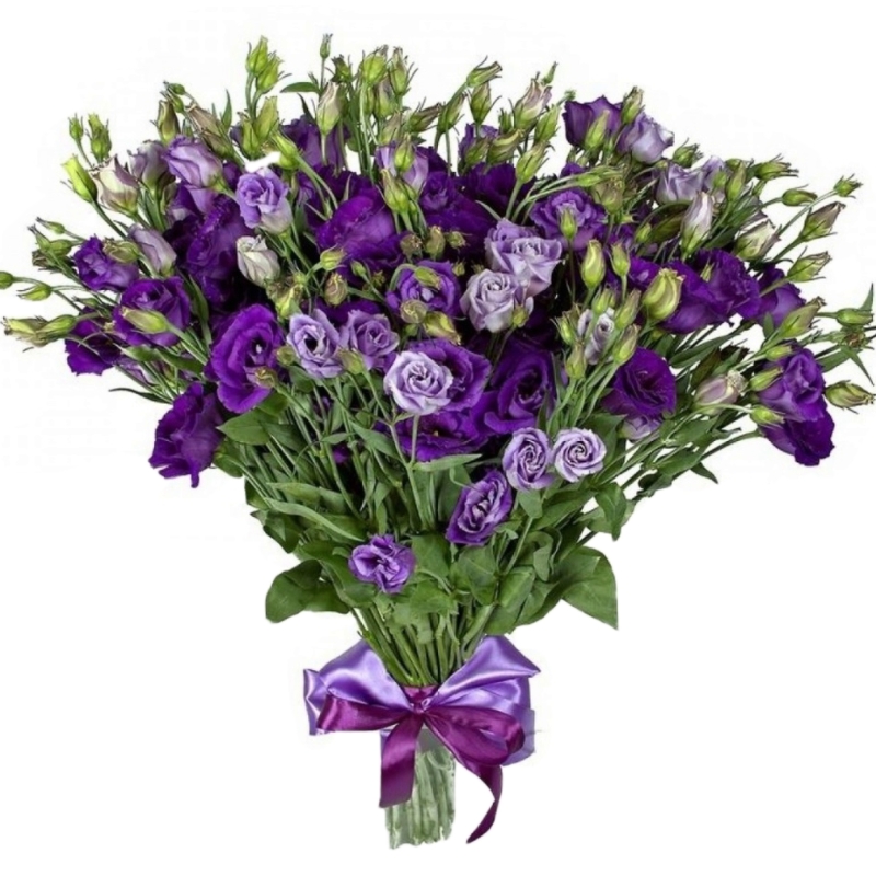 Букет состоит из 21 ветка эустомы, прозрачная упаковка, атласная лента.
