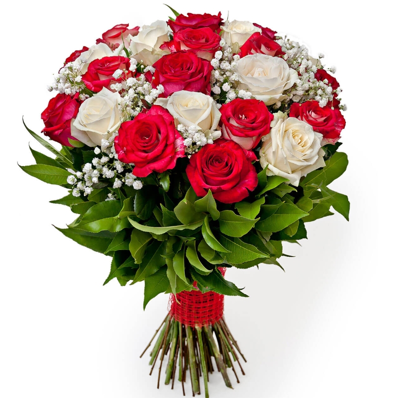 Букет состоит из 25 красных и белых роз, 2 ветки гипсофилы, зелень, прозрачная упаковка, атласная лента.