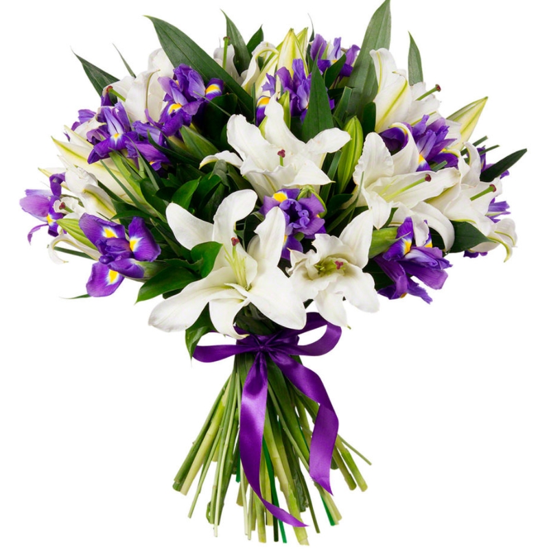 Букет состоит из 7 веток белых лилий, 20 ирисов, рускус, прозрачная упаковка, атласная лента.
