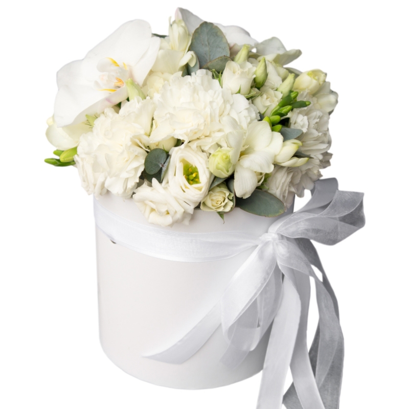 Букет состоит из 3 орхидеи, 3 фрезии, 4 ветки кустовой розы, коробка, оазис, атласная лента.