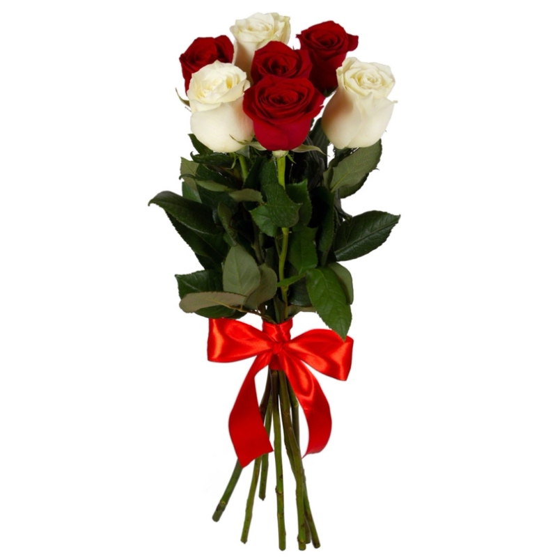Букет состоит из 4 красные розы, 3 белые розы, прозрачная упаковка, атласная лента.