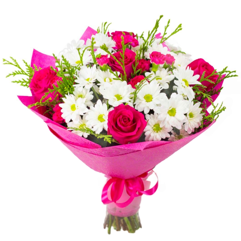 Букет состоит из 5 роз, 4 ветки хризантем, 2 ветки кустовой розы, 3 солидаго, красивая упаковка, атласная лента.