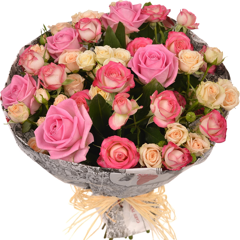 Букет состоит из 9 розовых роз, 10 веток розовой и кремовой розы, крафт.